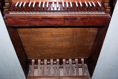 TASTIERA: singola a finestra di 47 tasti (Do1 – Re5) con prima ottava corta; tasti diatonici rivestiti con palissandro, con osso i cromatici.